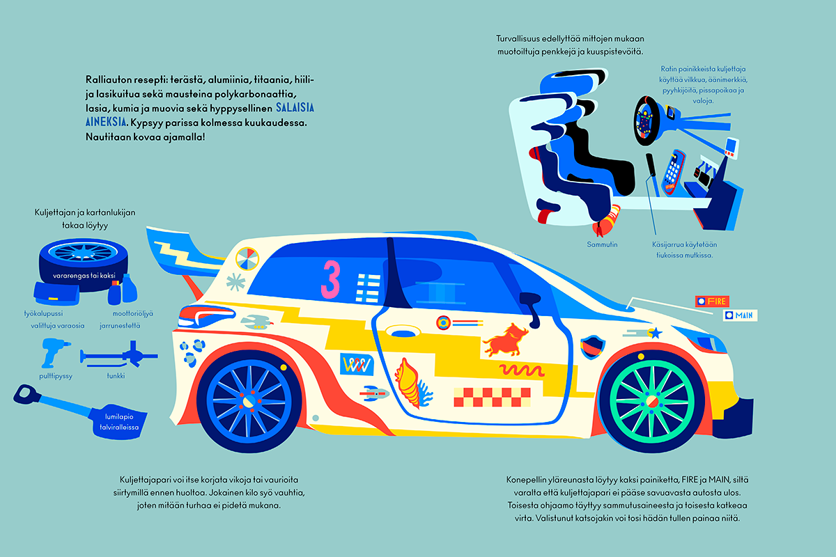A nonfiction picture book about rally car racing. Written by Pasi Lönn, published by Tammi. The book was chosen to the collection of the Most Beautiful Books of 2021. It received a Merit Award in the 3×3 International Illustration Annual No.19.