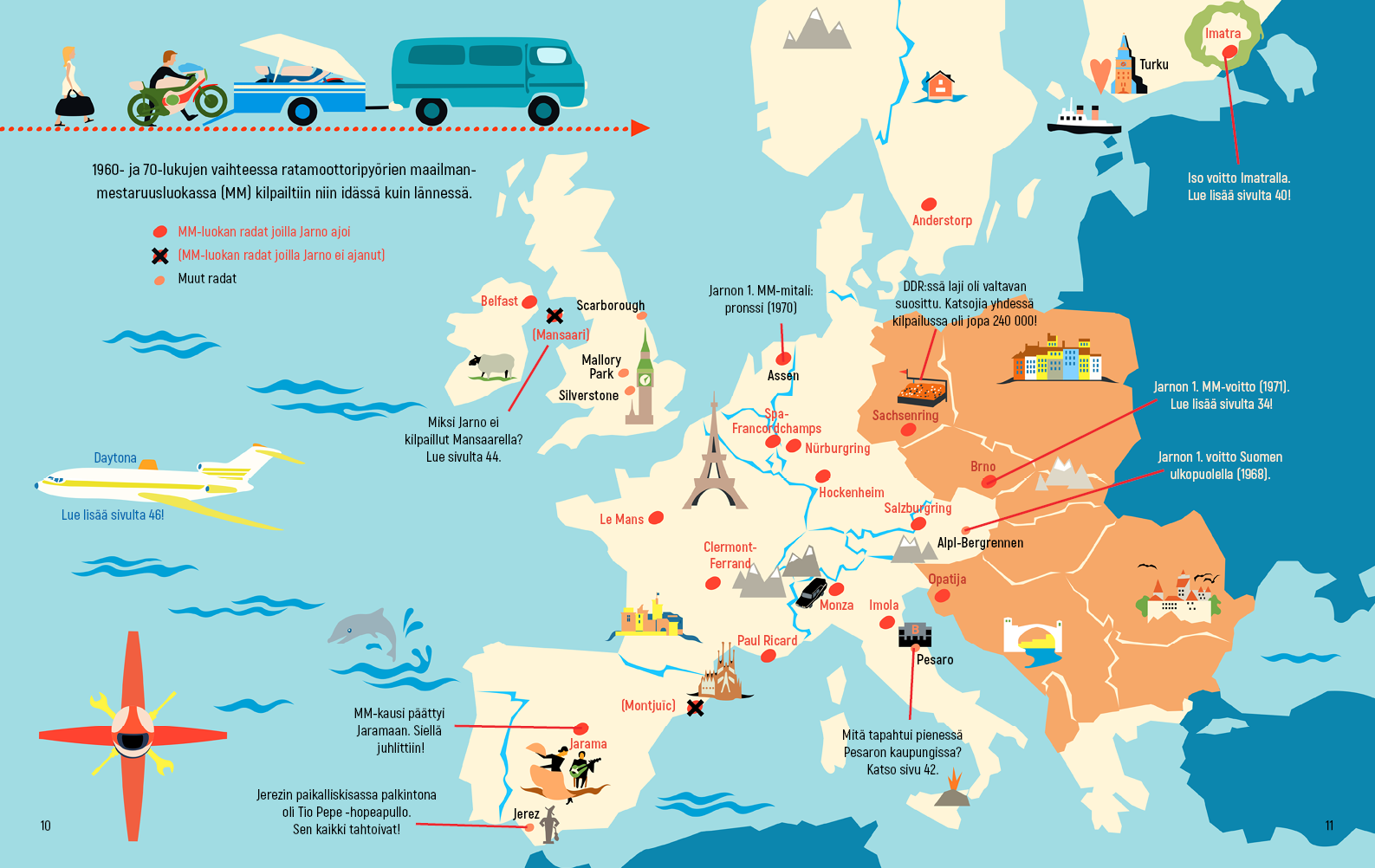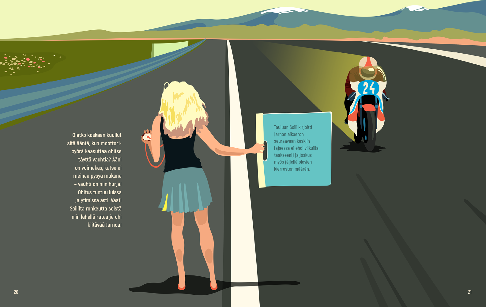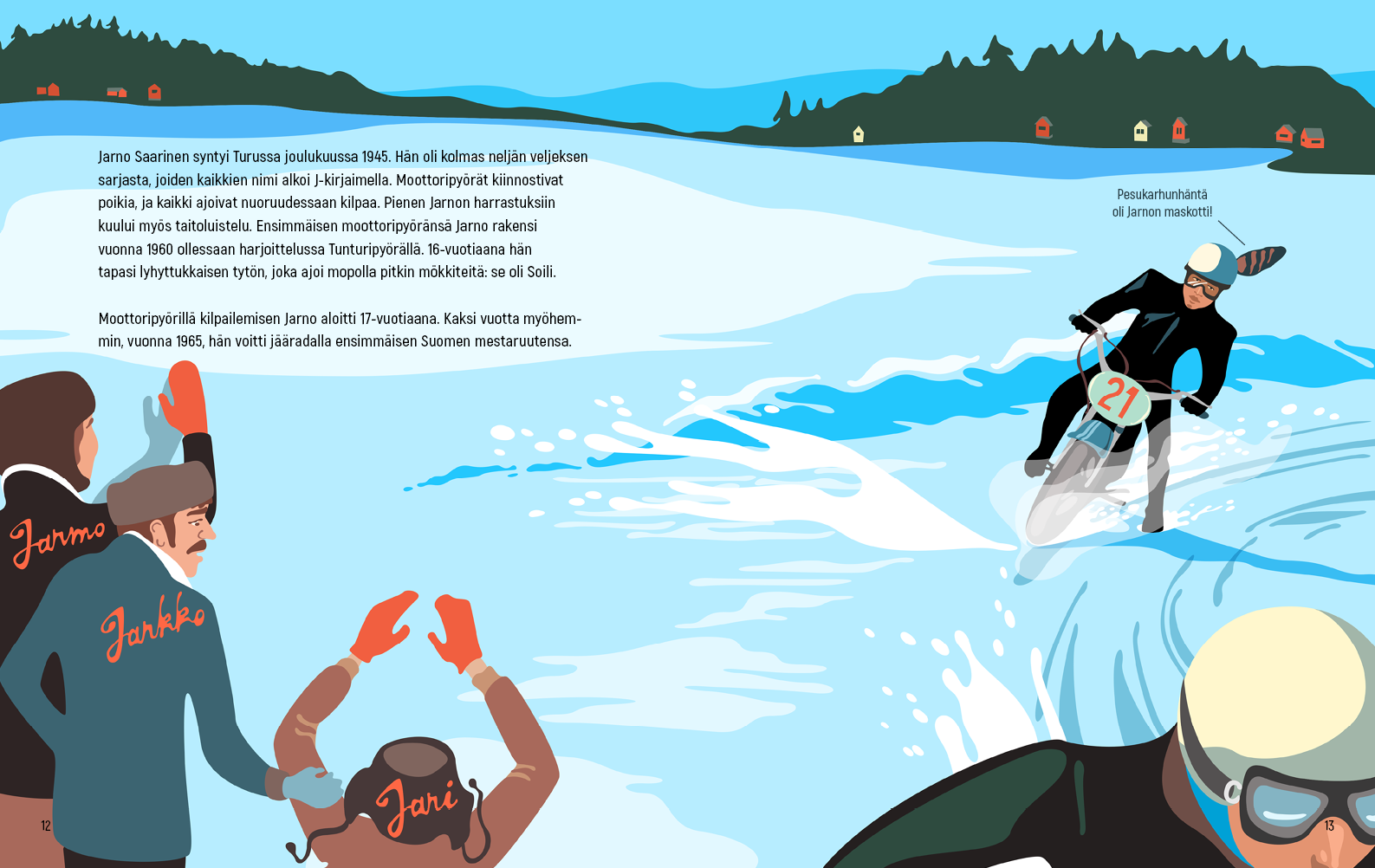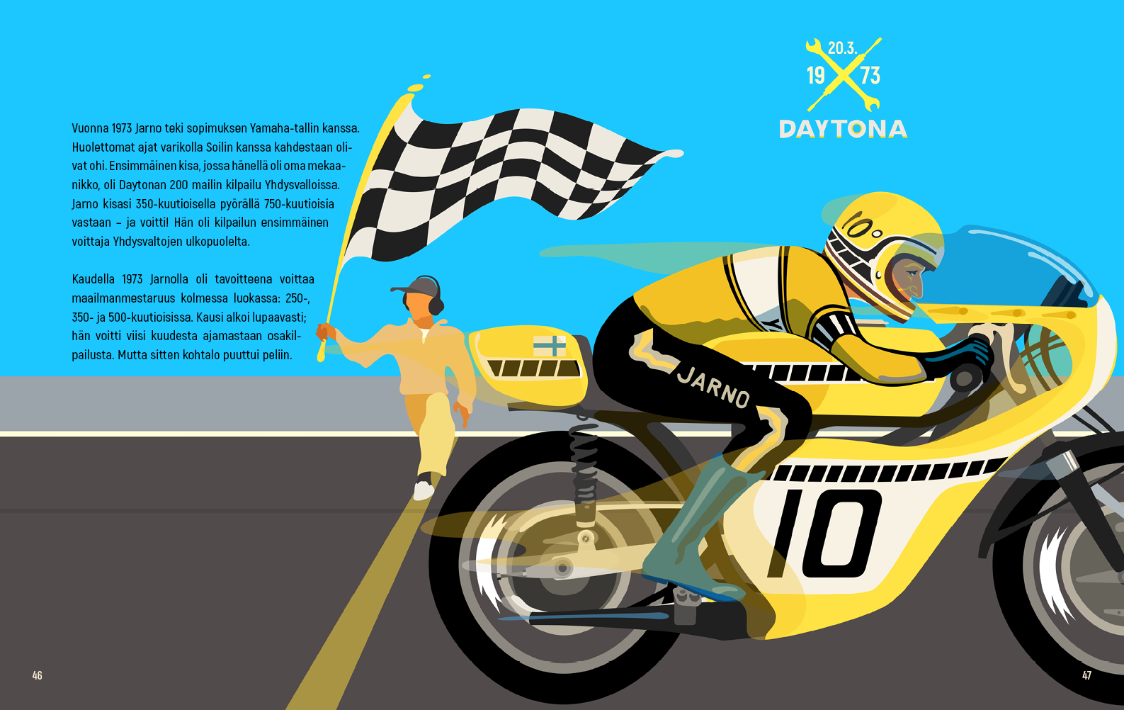 ”Pirita Tolvasen raikkaalla tyylillä piirtämä lastenkirja avaa kuvin, sanoin ja tilastofaktoin ratamoottoripyöräilyn maailmanmestari Jarno Saarisen traagisesti päättynyttä sankaritarinaa. Haastatteluihin ja dokumentteihin perustuva teos on taitava yhdistelmä vaikuttavaa tarinaa ja kirjaimellisesti teknisiä yksityiskohtia.”